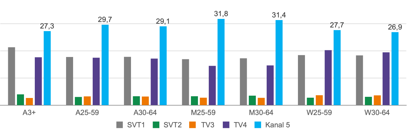 - Kanal 5 är största TV-kanal i alla säljmålgrupper och 3+ (AD).