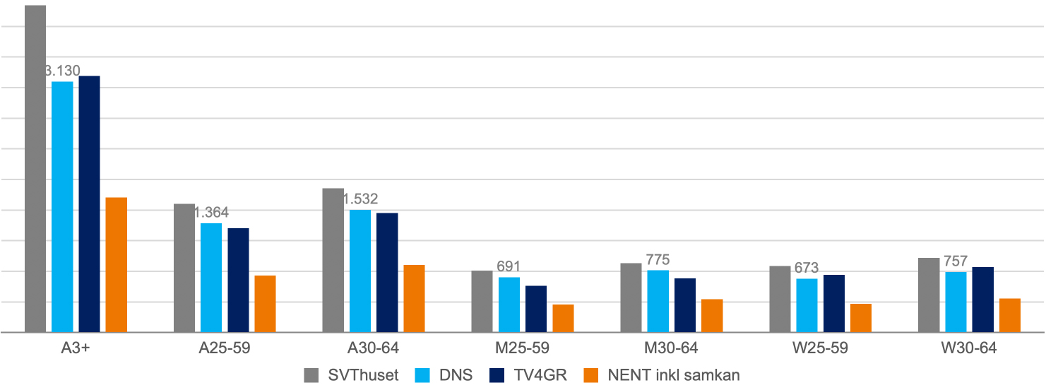 - Kanal 5 och DNS når fler än TV4 i A/M 25-59år/30-64år, jämna med TV4 i kvinnliga målgrupperna.