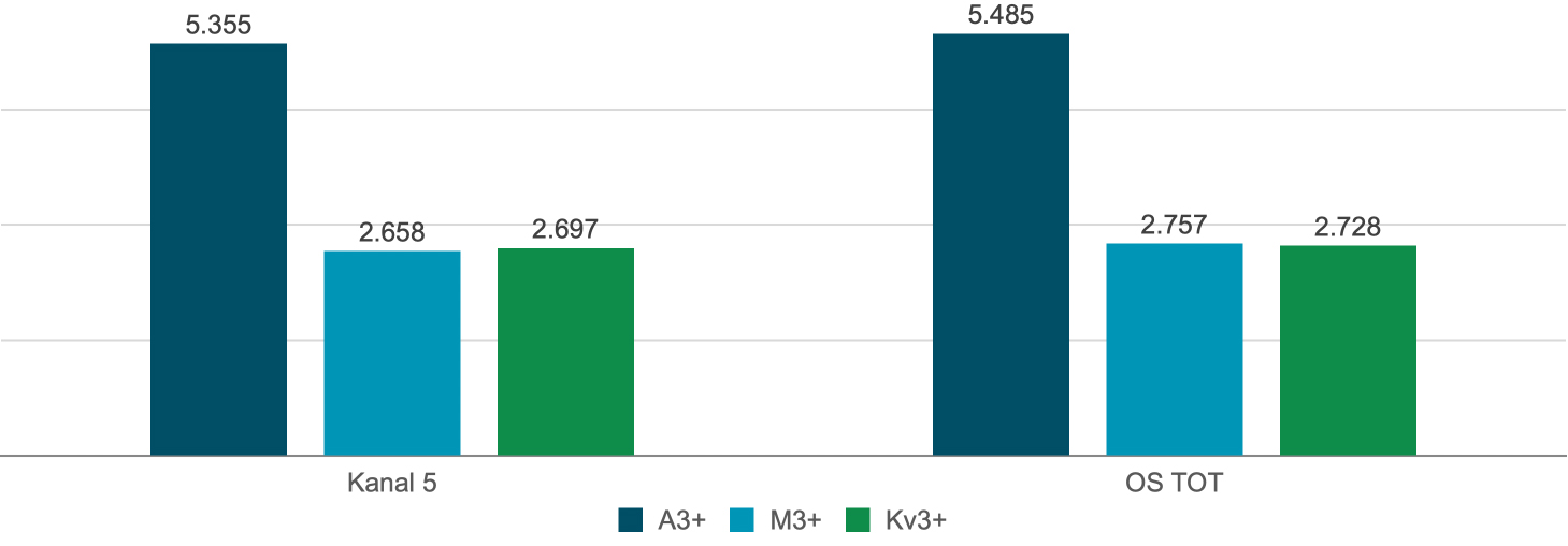 – Kanal 5 och DNS når fler än TV4 i A/M 25-59år/30-64år, jämna med TV4 i kvinnliga målgrupperna.
